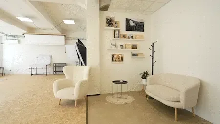 Photo of a photography studio with professional lighting equipment, backdrops, and seating areas.